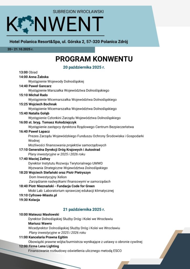 Program konwentu obejmuje szeroki zakres tematów istotnych dla rozwoju regionalnego. Uczestnicy będą mogli zapoznać się z planami inwestycyjnymi Generalnej Dyrekcji Dróg Krajowych i Autostrad oraz Dolnośląskiej Służby Dróg i Kolei na lata 2025-2026. Ponadto, omówione zostaną możliwości finansowania projektów samorządowych przez Wojewódzki Fundusz Ochrony Środowiska i Gospodarki Wodnej, strategiczne wyzwania dla województwa dolnośląskiego, zarządzanie nadwyżkami finansowymi w samorządach, a także obowiązki prawne wójtów i burmistrzów wynikające z ustawy o obronie cywilnej oraz innowacyjne metody finansowania oświetlenia ulicznego.